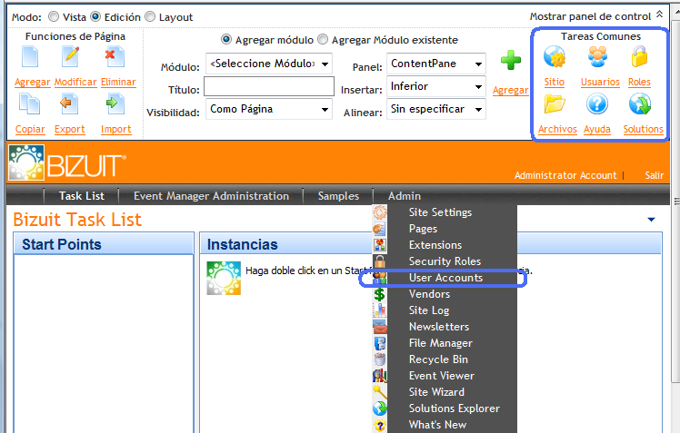 A través de la opción Tareas Comunes -> Usuarios o mediante el menú Admin->User Accounts se accede a la pantalla "User Accounts", la cual permite buscar y visualizar los usuarios definidos y permite agregar nuevos, eliminar y editar existentes: