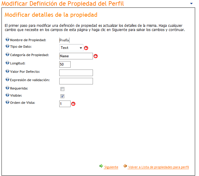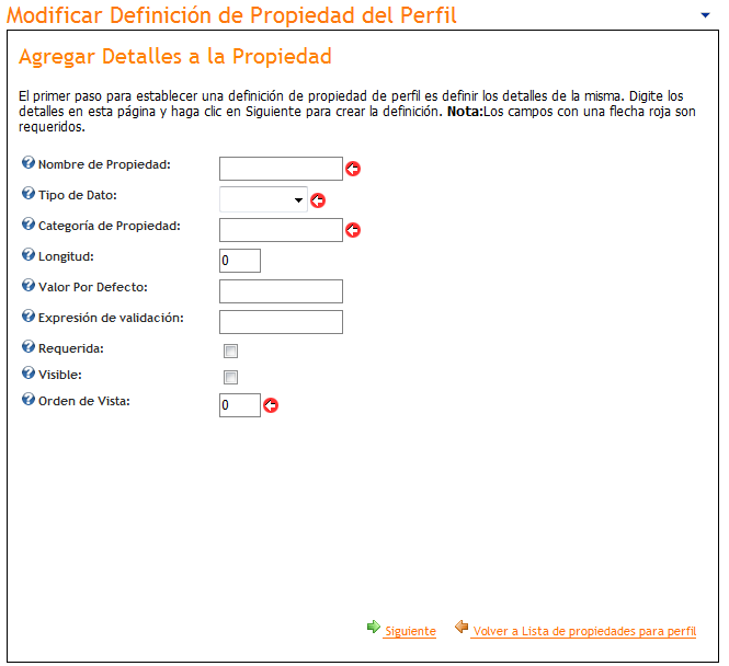 Presionando "Agregar Propiedad al Perfil" se accede a la siguiente pantalla, que permite la creación de una nueva propiedad de perfil. Los campos marcados con el icono