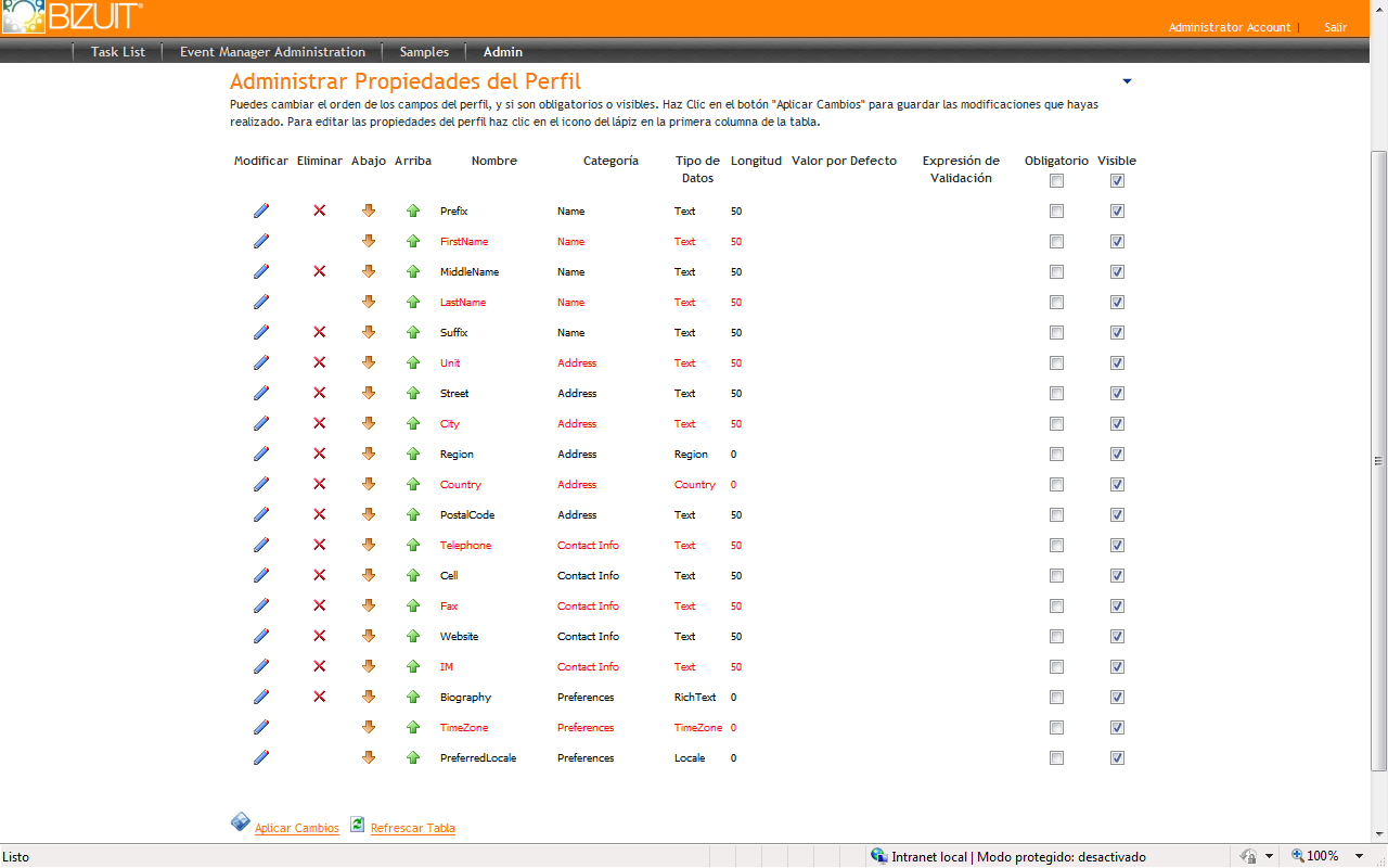 Mediante la opción "Administrar Propiedades del Perfil" es posible editar los campos que se encuentran disponibles dentro de la pestaña "Perfil" de cada cuenta de usuario.