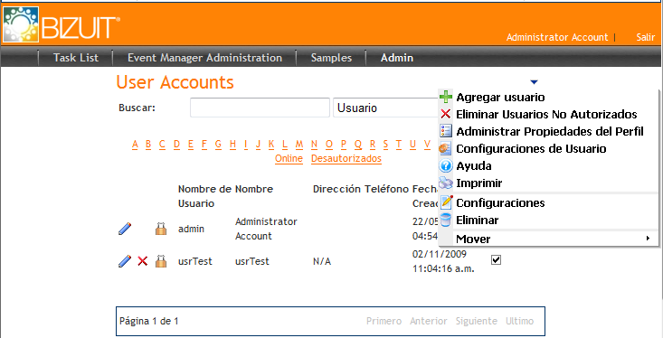 A través de la opción Tareas Comunes -> Usuarios o mediante el menú Admin->User Accounts se accede a la pantalla "User Accounts", la cual permite buscar y visualizar los usuarios definidos y permite agregar nuevos, eliminar y editar existentes: