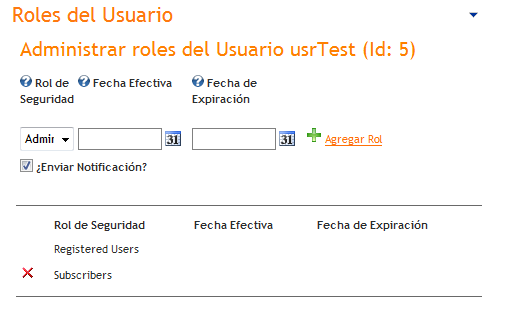 Desde la ventana Administrar Roles del Usuario es posible asignar y quitar roles del usuario, cada asignación de rol puede tener una fecha de inicio en la que el usuario efectivamente tendrá asignado el rol y una fecha de expiración en la que el usuario dejara de tener el rol. Adicionalmente es posible enviar una notificación al usuario del cambio en la asignación de roles.