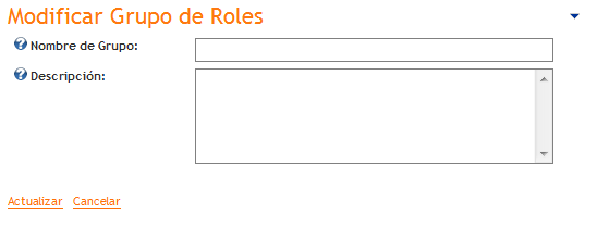 Presionando la opción "Agregar Grupo de Roles" se accede a la pantalla de creación de grupos de roles que permite agrupar roles permitiendo una administración más ordenada de los mismos. Haciendo clic en el botón "Actualizar" se crea el nuevo grupo, haciendo clic en "Cancelar" se vuelve a la pantalla anterior.