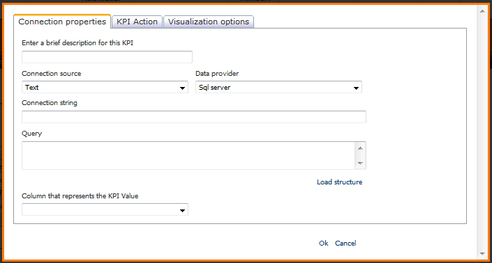 Al crear un nuevo indicador o editar uno existente desde la ventana de "Configuración del Servicio Extendido "KPI Management" se presenta la siguiente pantalla que se encuentra dividida en pestañas como se indica a continuación: