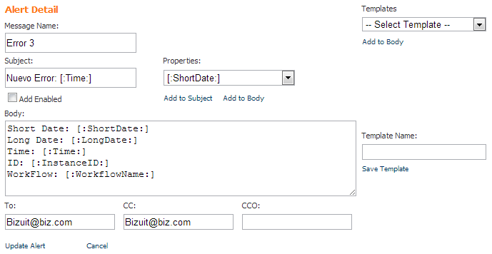 El módulo BIZUIT Alert Exceptions Editor permite visualizar una grilla con las alertas configuradas, con la opción de agregar una nueva alerta, editar una alerta anterior, visualizar los detalles, activar o desactivar alertas y eliminarlas.