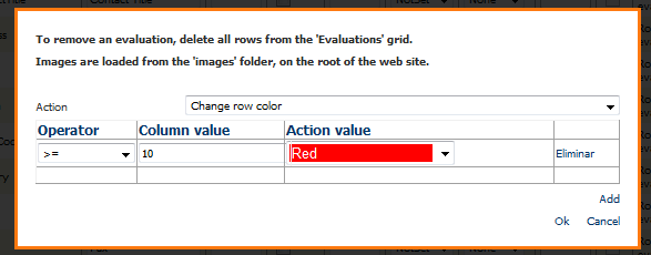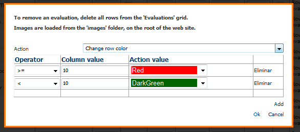 Presionando el link "Add" podemos agregar tantas evaluaciones como sean necesarias. En el siguiente ejemplo si el valor de la columna es mayor o igual a 10, se cambiará el color de fondo del registro a Rojo, si es menor a 10 se cambiará a Verde el color de fondo del registro. Tenga en cuenta que los rangos a evaluar deben ser especificados adecuadamente por el usuario para que sean lógicos: