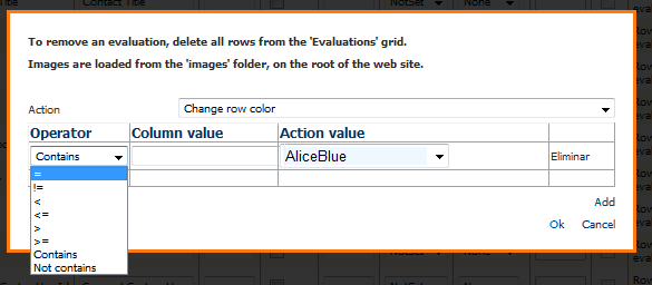 Si se desea cambiar el color de fondo de un registro cuando los datos de la columna configurada tengan un determinado valor, se debe seleccionar la acción "Change row color" y presionar el link "Add", se presentará la siguiente pantalla: