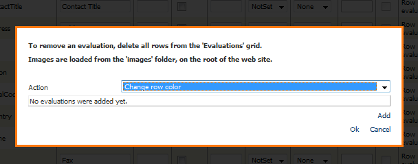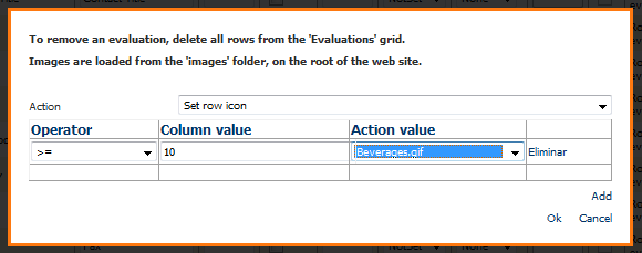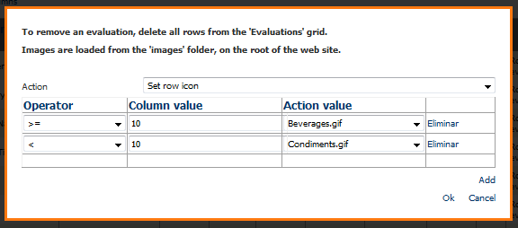 Presionando el link "Add" podemos agregar tantas evaluaciones como sean necesarias. En el siguiente ejemplo si el valor de la columna es mayor o igual a 10, se colocará como ícono del registro el archivo Beverages.gif y si es menor a 10 se colocará como ícono del registro el archivo Condiments.gif . Tenga en cuenta que los rangos a evaluar deben ser especificados adecuadamente por el usuario para que sean lógicos: