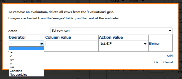 Si se desea colocar un ícono en un registro cuando los datos de la columna configurada tengan un determinado valor para ese registro, se debe seleccionar la acción "Set row icon" y presionar el link "Add", se presentará la siguiente pantalla: