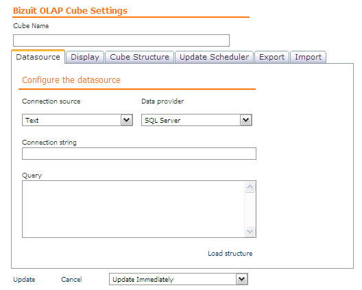 Permite indicar que el cubo se creará o actualizará inmediatamente después de haber seleccionado el link "Update", tenga en cuenta que si la consulta configurada devuelve gran cantidad de datos la página se quedará procesando hasta finalizar la consulta. |