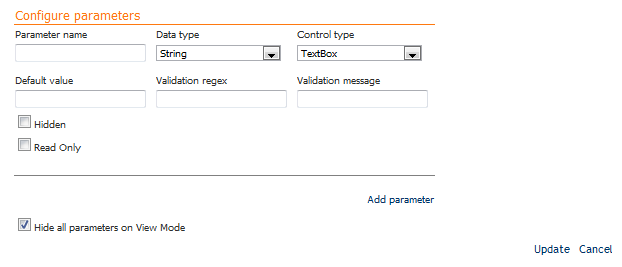 Esta opción permite ocultar los parámetros del módulo. Si se encuentra seleccionada esta opción, los parámetros se enviarán a los módulos BIZUIT Data Service existentes en la página donde el módulo BIZUIT Global Parameters se encuentre pero no podrán ser visualizados y editados por el usuario. |