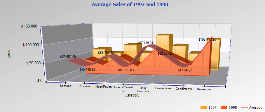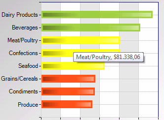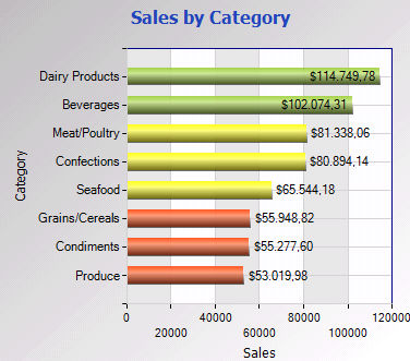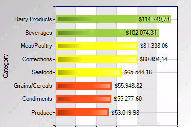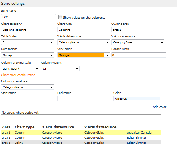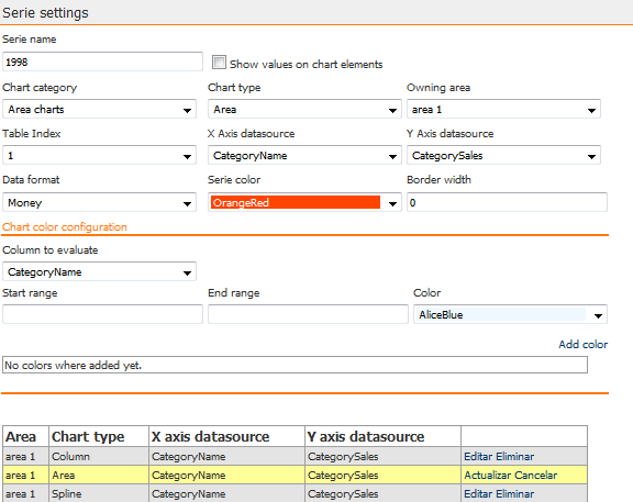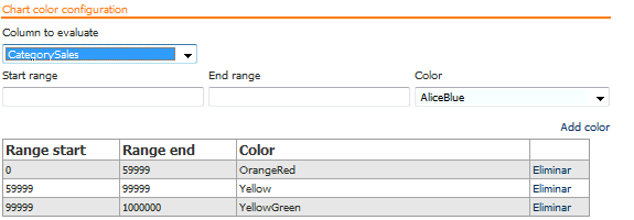 Permite determinar distintos colores para los elementos de la serie en función del valor del elemento. En el ejemplo que se muestra a continuación se configuró que si el valor del campo "CategorySales" devuelto por la sentencia SQL está entre 0 y 59999, el elemento se pinte de color naranja, si está entre 59999 y 99999 se pinte de amarillo y si es superior a 99999 se pinte de verde.
