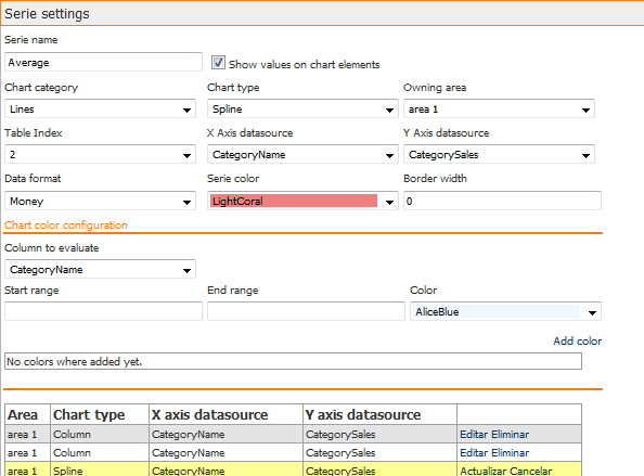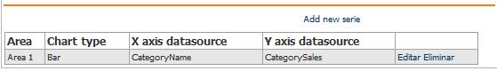 En la sección "Serie Settings" es posible determinar las series de datos que se graficarán en las áreas configuradas. Es posible determinar tantas series como sean necesarias y aplicar dichas series a las distintas áreas configuradas así como es posible agregar más de una serie a una determinada área siempre y cuando los tipos de gráficos (campo "Chart type") de las series sean compatibles. En la versión 2.5.8.0 de BIZUIT Dashboard, la compatibilidad soportada es entre los tipos de gráficos: