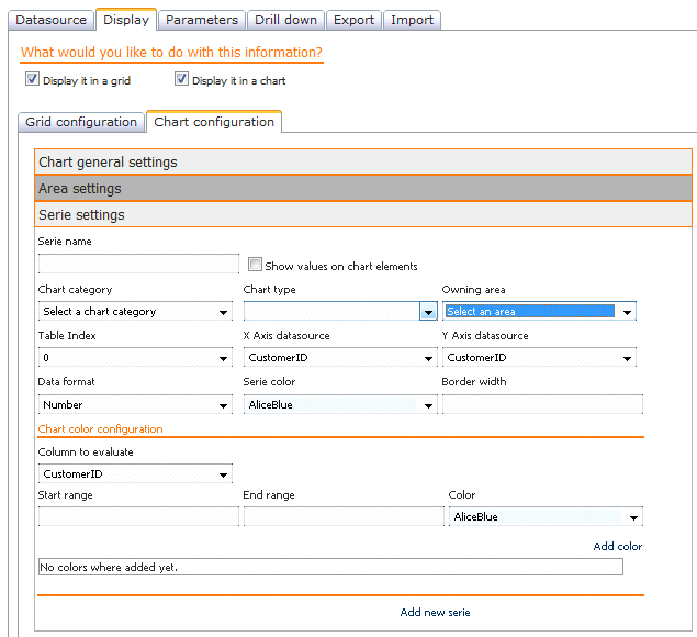 Al seleccionar la opción "Display it in a chart" en la pestaña "Display" se presenta una pestaña de configuración de la forma de visualizar la información en la formato gráfico dividida en las secciones General, Area y Serie junto con una sección en la que se podrá previsualizar la apariencia del gráfico configurado.