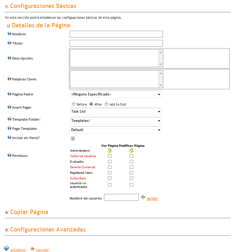 Permiten seleccionar la plantilla que se usará para crear la página. |