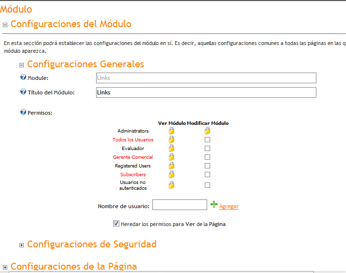Permite definir los permisos de edición y visualización para el modulo, es posible hacer que herede los permisos de la pagina tildando el checkbox “Heredar los permisos para Ver de la Página" (opción predeterminada) Se presentan todos los Roles disponibles y es posible asignar permisos de visualización o edición a un usuario en particular escribiendo el nombre de dicho usuario en el control "Nombre de usuario" y presionando el link "Agregar", de esta manera es posible especificar en detalle los permisos de un usuario para la edición y/o visualización del módulo independientemente de su rol. |