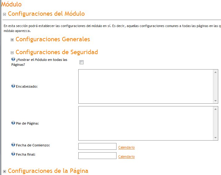 Desde la sección Configuraciones de Seguridad es posible determinar si el módulo estará disponible en todas las páginas, un encabezado y pie general, así como especificar si se desea que el módulo esté visible solamente en un determinado rango de fechas.