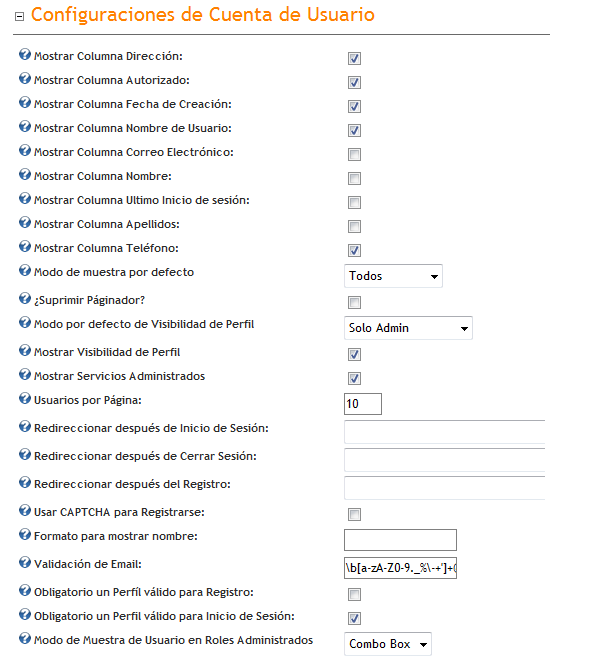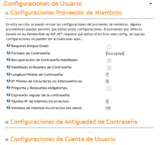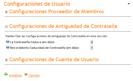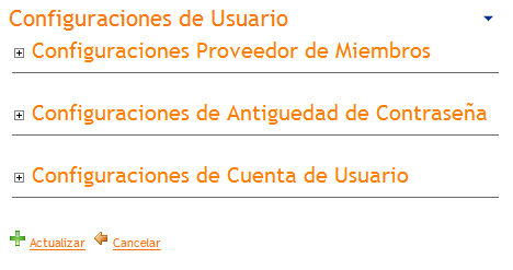 Mediante la opción "Configuraciones de Usuario" es posible visualizar las secciones "Configuraciones Proveedor de Miembros" y "Configuraciones de Antiguedad de Contraseña", (las cuales solo son editables desde el archivo web.config de BIZUIT Dashboard Server) y editar las opciones "Configuraciones de Cuenta de Usuario".