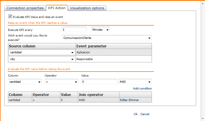La pestaña "KPI Action" permite configurar la ejecución de un determinado evento de BIZUIT Event Manager cuando los datos devueltos por la sentencia SQL cumplan con una serie de condiciones, pudiendo pasar a los parámetros del evento el valor de dichos datos
