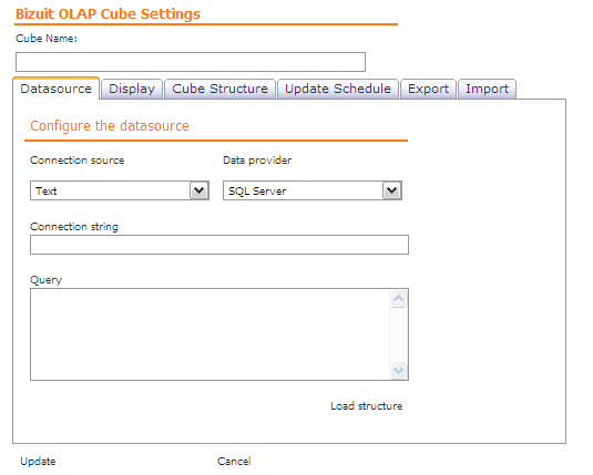 La pestaña Datasource permite especificar el origen de los datos que conformarán la estructura del cubo: