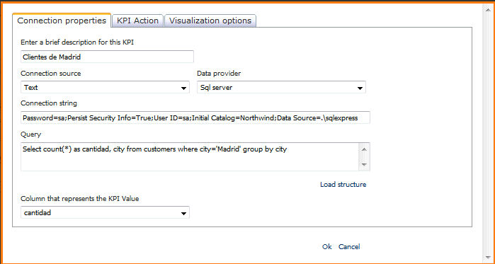Cadena de conexión a la base de datos que se consultará. El formato de la cadena de conexión se debe corresponder con la opción seleccionada en la lista desplegable "Data provider". Visitando este sitio encontrará las distintas formas de especificar una cadena de conexión en función del tipo de proveedor y base de datos. |