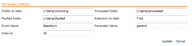 El servicio extendido "File System Watcher" permite monitorear a intervalos regulares los cambios realizados en una determinada carpeta del sistema operativo, permitiendo ejecutar un evento configurado en BIZUIT Event Manager Server cada vez que un archivo con una determinada extensión se agregue a dicha carpeta.