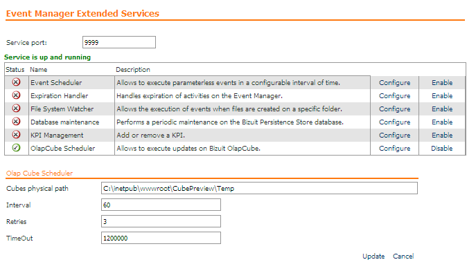 El servicio extendido "OlapCube Scheculer" permite realizar la actualización programada en los distintos módulos "BIZUIT OLAP Cube" instanciados en el sitio.