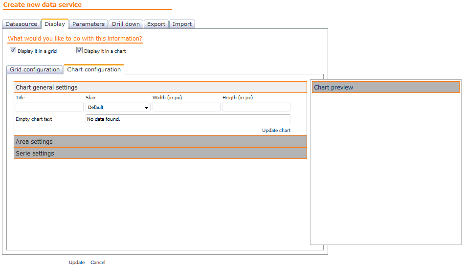 Al seleccionar la opción "Display it in a chart" en la pestaña "Display" se presenta una pestaña de configuración de la forma de visualizar la información en la formato gráfico dividida en las secciones General, Area y Serie junto con una sección en la que se podrá previsualizar la apariencia del gráfico configurado.
