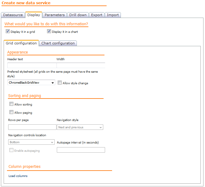 Al seleccionar la opción "Display it in a grid" en la pestaña "Display" se presenta una pestaña de configuración de la forma de visualizar la información en la grilla dividida en las secciones apariencia, ordenamiento y paginado y propiedades de las columnas.