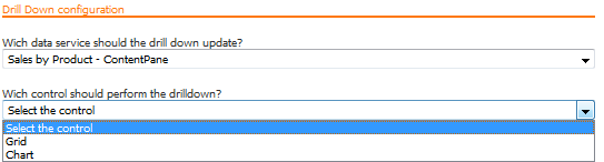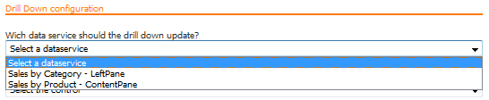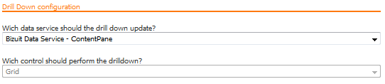 En caso que el módulo BIZUIT Data Service seleccionado en la opción "Which data service should the drill down update?" se encuentre configurado para visualizarse solamente en formato tabular o en formato gráfico, la lista mostrará la única configuración de visualización de dicho módulo de origen a la cual se aplicará la funcionalidad de drilldown