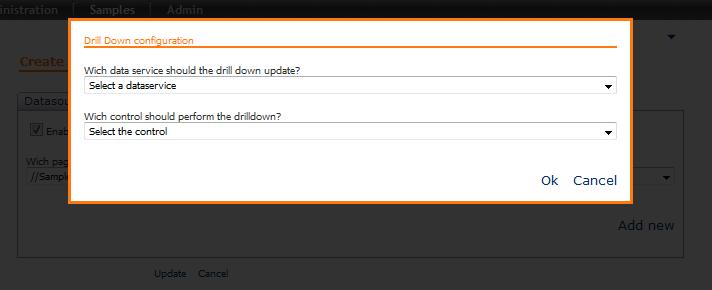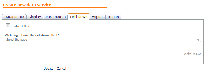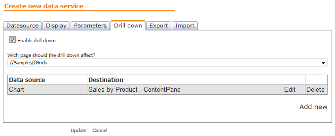 Presionando el link "Ok" se permite su posterior edición y eliminación así como la posibilidad de configurar más opciones de DrillDown mediante la opción "Add new"