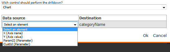En caso que el control de visualización del módulo de origen seleccionado en la opción "Which control should perform the drilldown?" sea un gráfico (Chart) la lista desplegable de la columna DataSource se llenará con