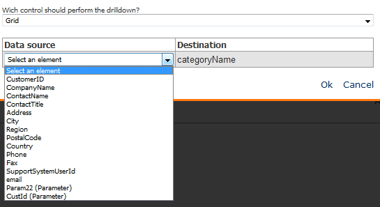 En caso que el control de visualización del módulo de origen seleccionado en la opción "Which control should perform the drilldown?" sea una Grilla (Grid) la lista desplegable de la columna DataSource se llenará con: