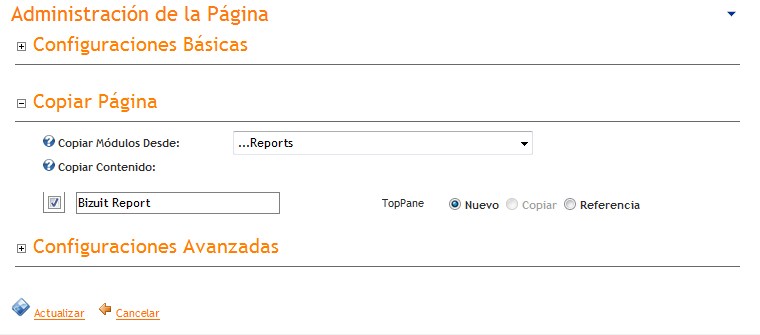 La opción "Copiar Página", permite generar una página a partir de una ya existente, tomando sus módulos, es posible seleccionar cuáles incluir en la nueva página.
