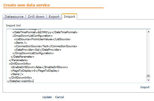 La pestaña Import permite importar la definición de un módulo BIZUIT DataService que haya sido exportado previamente. La importación puede realizarse en la misma instalación de BIZUIT Dashboard desde la cual se realizó la exportación de la configuración del módulo o bien en otra diferente.
