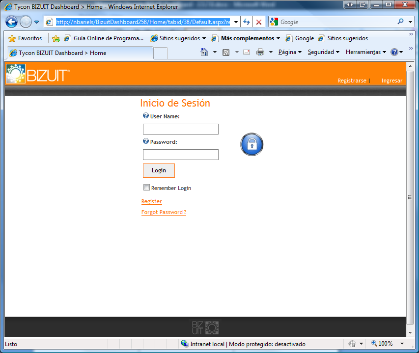 A continuación se muestra la pantalla de inicio de sesión de BIZUIT DashBoard: