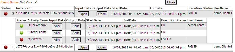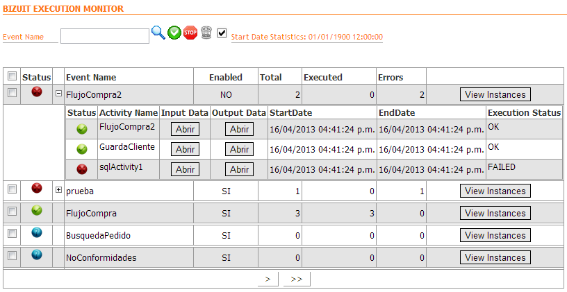 El módulo BIZUIT Execution Monitor permite visualizar la ejecución de los eventos configurados en BIZUIT Event Manager. Mediante íconos permite la rápida visualización de aquellos eventos con errores y aquellos que se completaron correctamente.