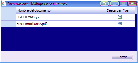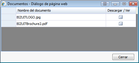 De manera predeterminada presenta 3 columnas iniciales: Icono Adjuntos: Al hacer clic sobre la columna se presenta la siguiente pantalla conteniendo dichos adjuntos, al hacer clic en el ícono de la columna "Descargar / Ver" se permite descargar o visualizar el archivo adjunto.
