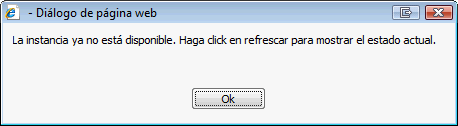 Permite actualizar la lista de tareas pendientes en la actividad o evento seleccionado en el panel "Tareas". Una vez finalizada la instancia, la misma permanece en la grilla hasta que se actualicen los datos mostrados, ya sea presionando este botón o seleccionando nuevamente la actividad en el panel "Tareas". Al intentar ejecutar una instancia que ya fue ejecutada pero aun se muestra en la grilla se presenta el siguiente mensaje: