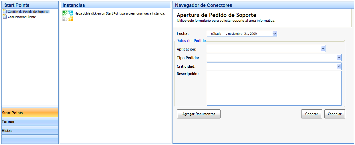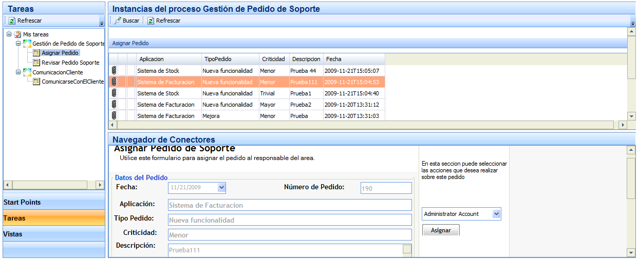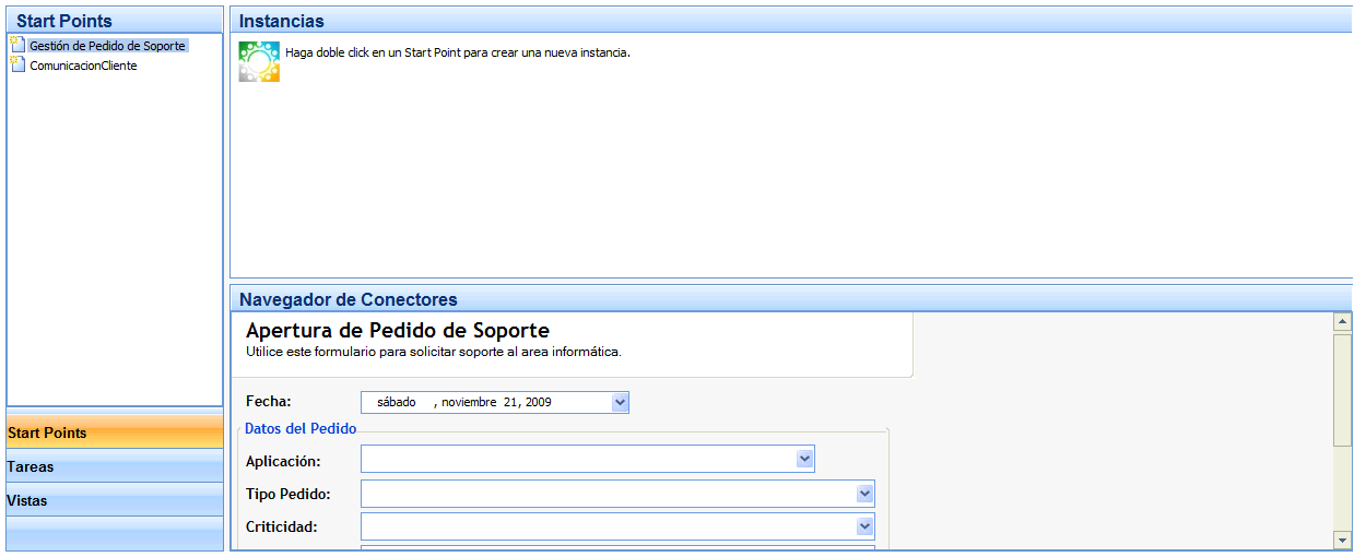 - Conector de una actividad de tipo "User Interaction Activity" en panel "Navegador de Conectores" ubicado a la derecha del panel "Instancias"