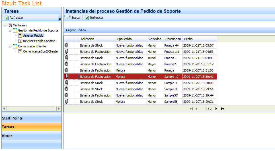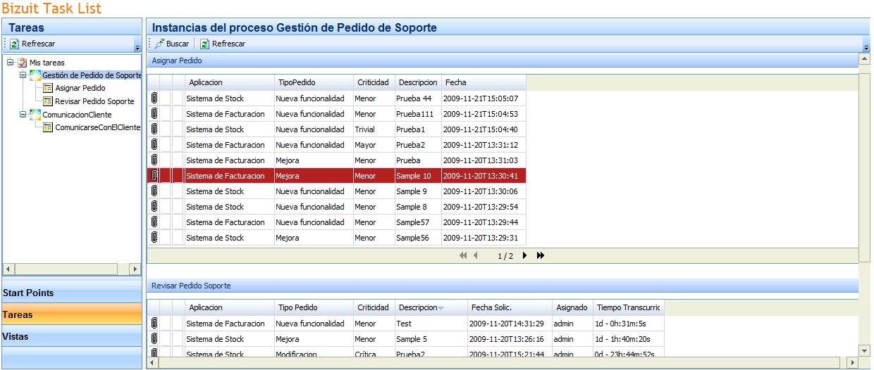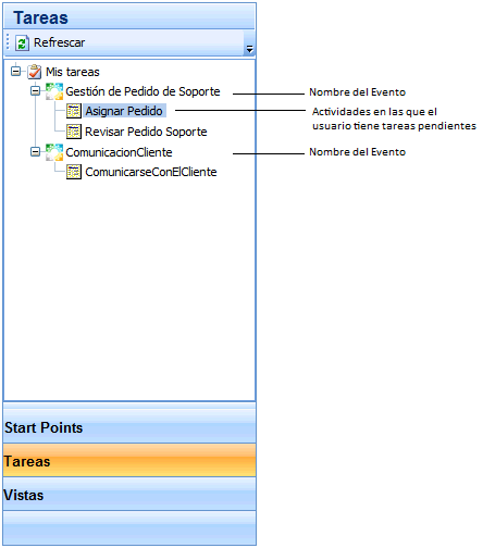En el panel Tareas se muestran todos los eventos y sus correspondientes actividades en las cuales el usuario logueado tiene tareas pendientes. Los nombres de las actividades se obtienen de la propiedad "Display Name" de las actividades "User Interaction" presentes en la reacción asociada al evento.