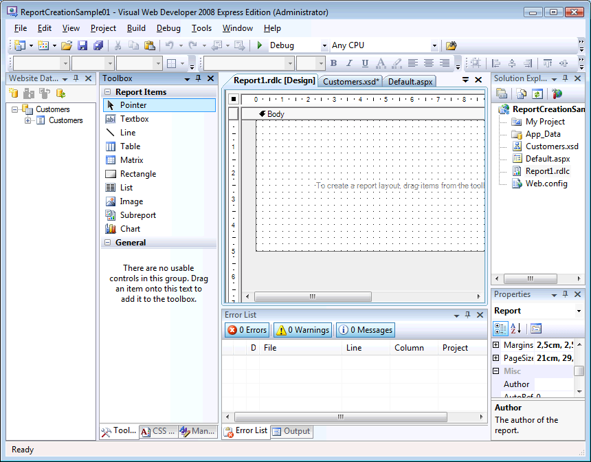 - Arrastrar a la vista de diseño del archivo Report1.rdlc el objeto Table disponible en la Toolbox: