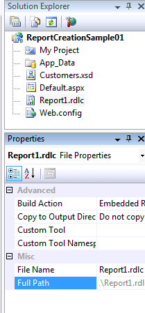 - En la ventana Solution Explorer, seleccionar el archivo recientemente creado y en sus propiedades seleccionar y copiar el valor de "Full Path" que indica su ubicación en disco. Esta ubicación es la que se utilizará en la configuración del módulo BIZUIT Reports para subir el archivo al servidor de BIZUIT Dashboard de manera que pueda ser visualizado.