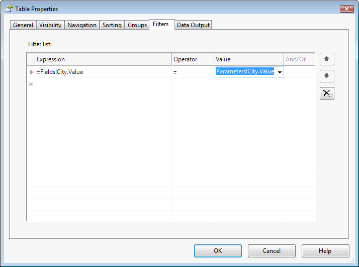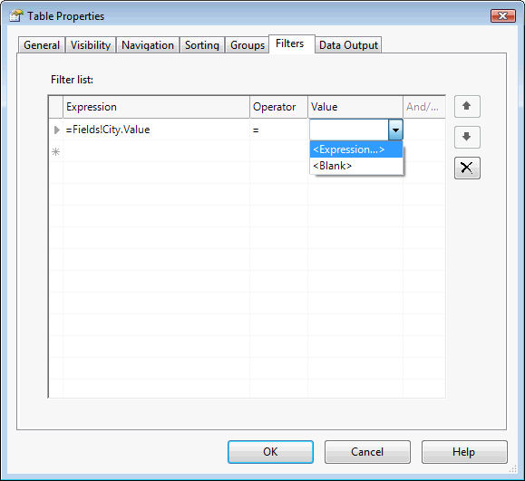 - Se presentará la siguiente pantalla, seleccionar la pestaña "Filters". En la columna Expression seleccionar el campo del origen de datos a filtrar, el operador a aplicar y el valor del filtro, que se construye a partir de una expresión.