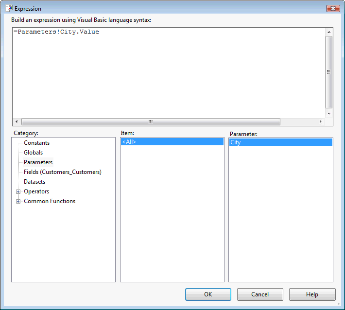 - Dentro de la expresión es posible tomar valores de la colección de parámetros del reporte. De esta forma dentro del modulo BIZUIT Reports estos parámetros serán utilizados como filtros para restringir el conjunto de datos mostrado por el reporte (junto con los parámetros definidos dentro de la consulta si se trata de una consulta de texto o junto con los parámetros del stored procedure), cada uno de estos parámetros se visualizará en un control acorde a su tipo de datos (por ejemplo, si se trata de un dato de tipo fecha se muestra un control del tipo DatePicker)