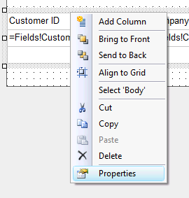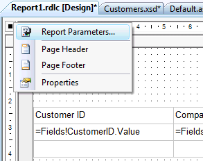 - Seleccionar la opción "Report Parameters" en el menú contextual que se despliega al hacer clic con el botón derecho sobre el extremo superior izquierdo de la vista diseño del archivo de reporte: