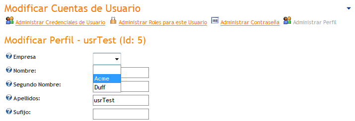 Supongamos que necesitamos crear una lista de Empresas desde la cual seleccionar la empresa a la que pertenece un determinado usuario. En la opción Admin->User Accounts seleccionamos del menú desplegable la opción "Administrar Propiedades del Perfil"