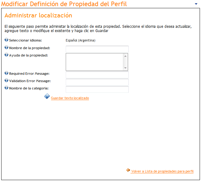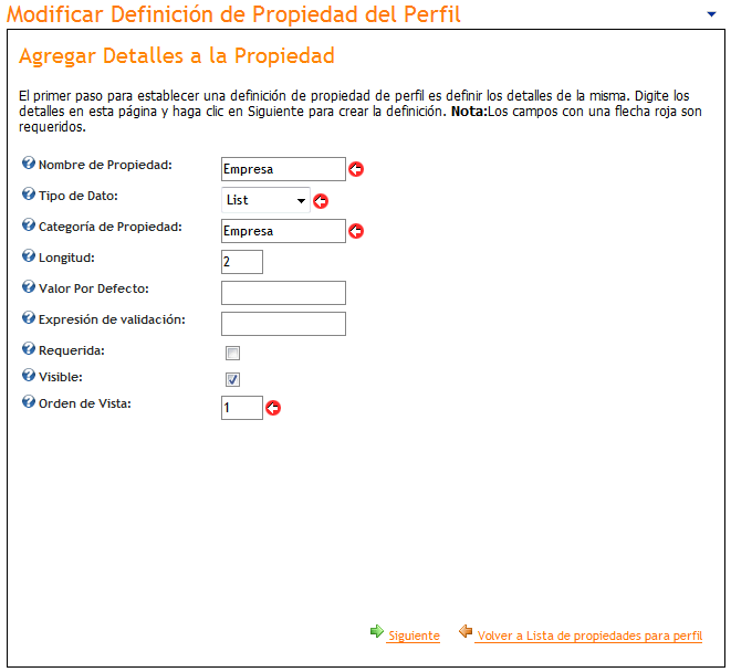 Al seleccionar la opción "Agregar Propiedad al Perfil" se accede a la siguiente pantalla: