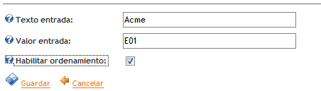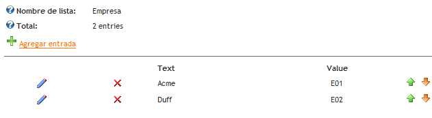 Al hacer clic en la opción "Agregar Entrada" se debe especificar el texto a mostrar y su valor por cada uno de los elementos de la lista: