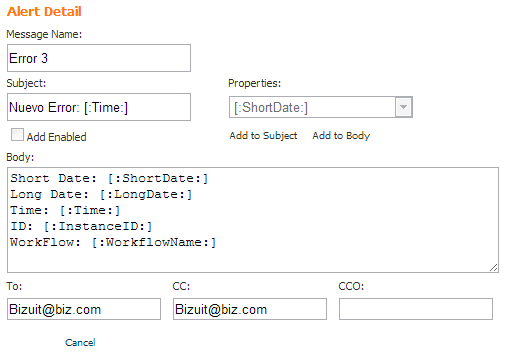 Al hacer click en el botón Add to Body, se añadirá el ítem seleccionado de la lista del campo Properties, al área de texto Body.