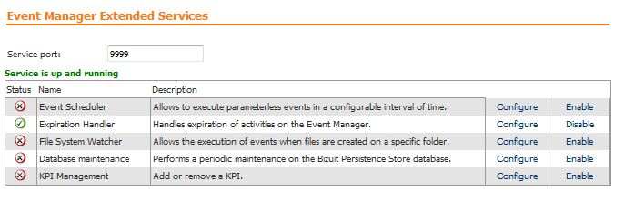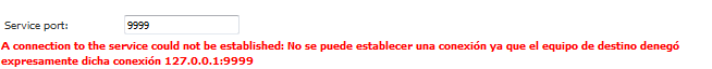 Puerto TCP donde se encuentra configurado el servicio de Windows "Tycon Bizuit Extended Services" instalado junto con BIZUIT Dashboard Server. Por defecto el servicio se instala en el puerto 9999, pero puede ser modificado en la tabla ExtendedServiceProperties de la base de datos de BIZUIT Event Manager (registro cuyo campo IdServiceType=0) Si el servicio se encuentra levantado y funcionando correctamente se presentará el mensaje "Service is up and running" Si el servicio no se encuentra levantado o está funcionando incorrectamente se presentará el siguiente mensaje en cuyo caso se deberá examinar el visor de sucesos de Windows para determinar la causa de la falla.